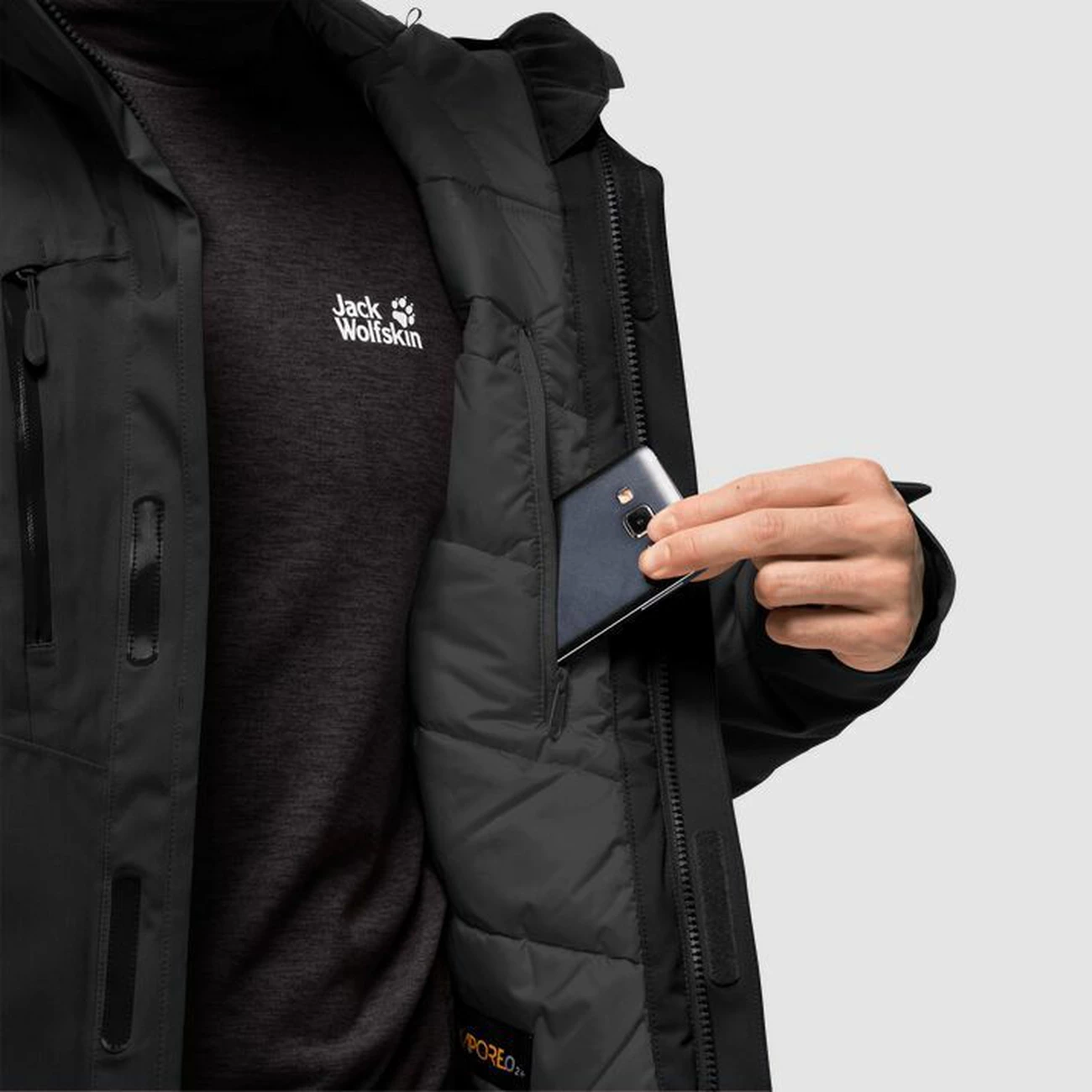 À l’extérieur nous l’avons équipée de notre TEXAPORE O2+ particulièrement respirant. Il est élastique et vous offre ainsi un confort de port particulièrement élevé. Et puis il est évidemment imperméable et coupe-vent.